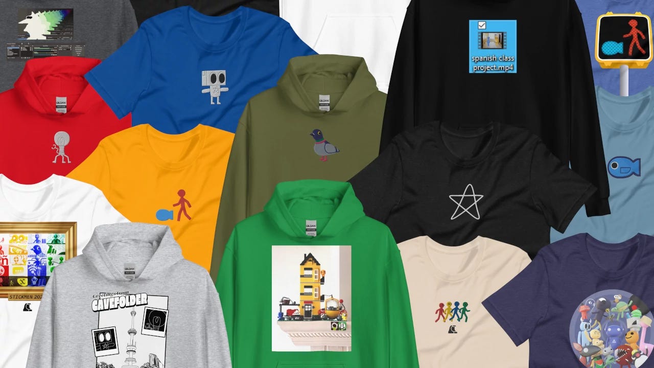 The Gallery page contains all the fan art I’ve received over my past decade of YouTube-ing. Browse through everyone’s work organized by year, and see the characters change from blue robots to colorful stickmen over time. There’s also a LOT of cavefolder drawings. Very cool! You can find it at wavetro.net/gallery.